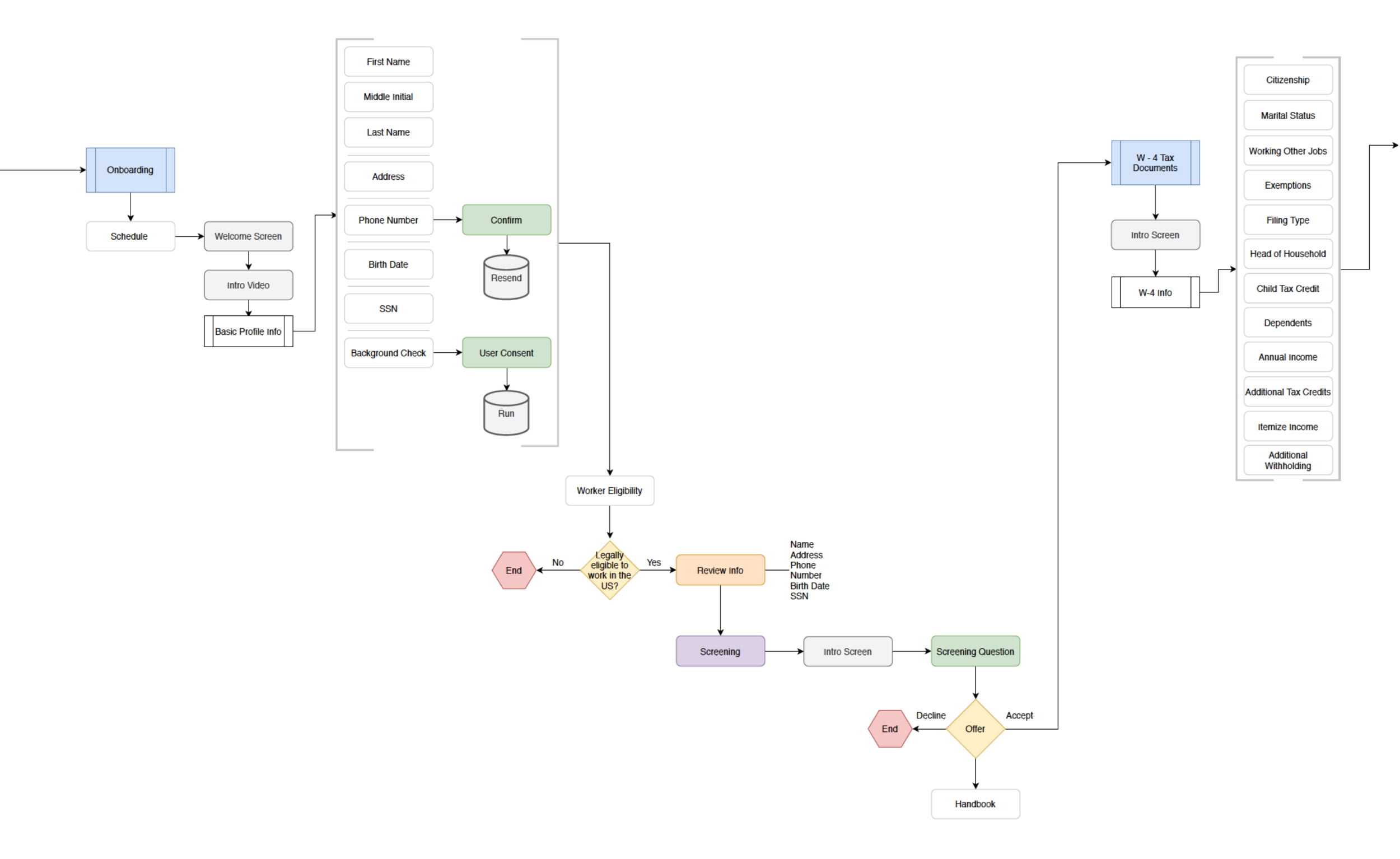 To kickoff the onboarding feature we created a workflow to document the steps required for hiring a worker in the U.S. The outcome resulted in six categories: